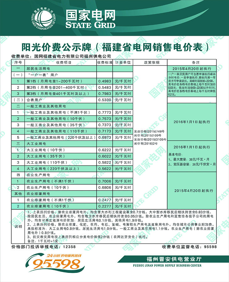 福州市電費價格一覽表: