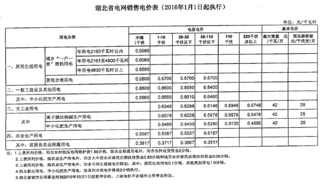 湖北省電網躉售電價表(2016年4月1日起執行)