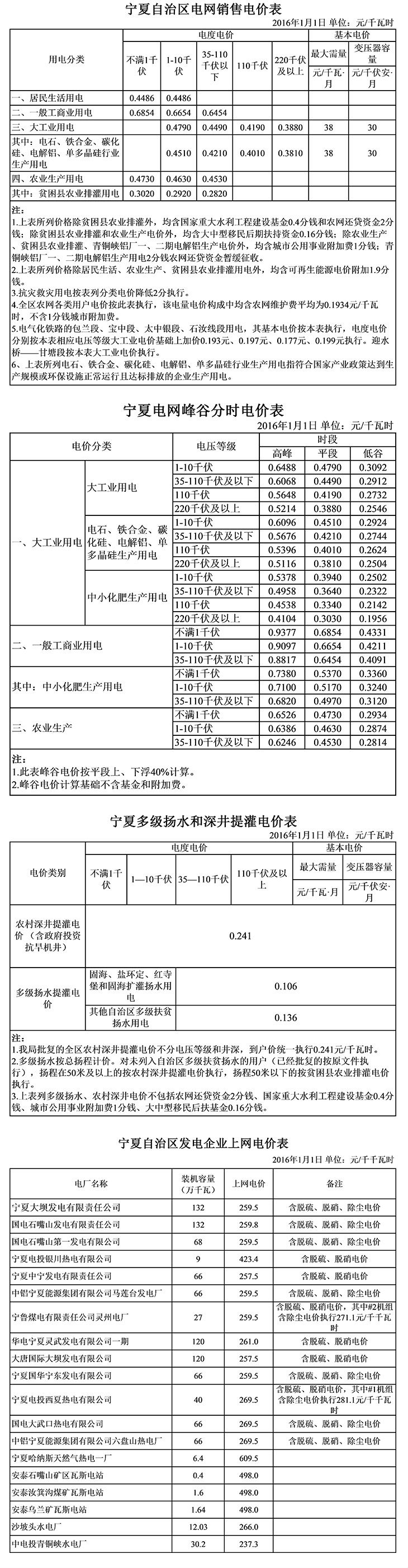 寧夏省電網銷售價格表
