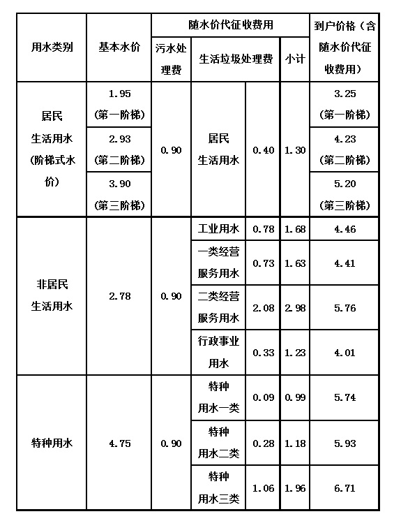 四、居民生活用水階梯式計量水價,一戶一表第一階梯每戶定員人口為4人,超過定員人口的,憑常住戶口簿向我公司申請,經(jīng)核實后,第一階梯每戶月用水量按7立方米/人計。每戶人口不超過4人的,月用水量大于28立方米但不超過40立方米的部分執(zhí)行第二階梯水價,超過40立方米的部分執(zhí)行第三階梯水價;每戶人口超過4人的,月用水量大于(7立方米×核實人數(shù))但不超過(10立方米×核實人數(shù))的部分執(zhí)行第二階梯水價,超過(10立方米×核實人數(shù))的部分執(zhí)行第三階梯水價。