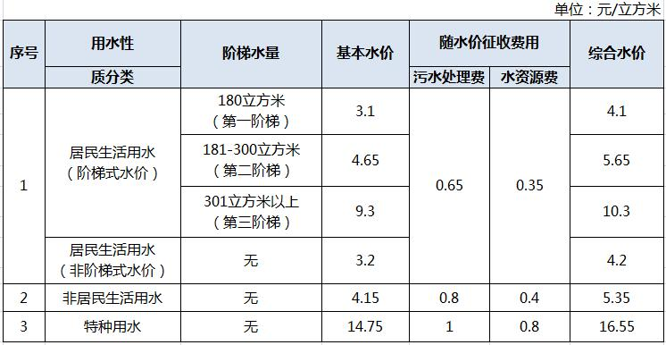 用水分類 | 基本水價 | 附加費 | 污水處理費 | 水資源費 | 綜合水價 |